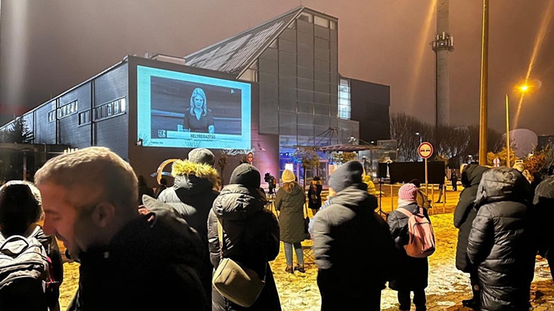 A közmédia Kunigunda úti székházának épületére vetítették ki pénteken a 444.hu karaktergyilkosságokról szóló dokumentumfilmjét, a Valótlanult.